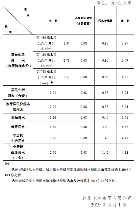 达州市城区供水销售价钱一览表