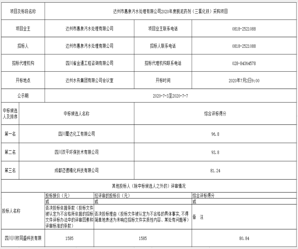 上一篇:达州市惠泉污水处置惩罚有限公司2020年度单过硫酸氢钾复合粉采购项目中标候选人公示