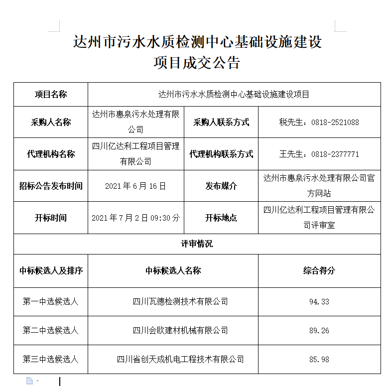 达州市污水水质检测中心基础设施建设项目成交通告