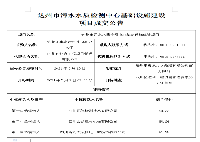 问题:达州市污水水质检测中心基础设施建设项目成交通告